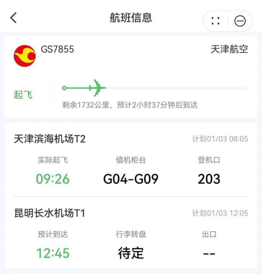 ▲图源:航旅纵横3日上午10时许,记者致电天津滨海国际机场询问GS7855次航班状态。客服人员介绍,这是一趟天津飞昆明的航班,计划3日上午8:05起飞,实际上是9:26起飞,延误原因不清楚,可咨询天津航空公司。天津航空公司的客服人员称,该航班延误是因为准备起飞时,又有一个滑回的过程,备注的是旅客原因,具体情况不清楚。天津滨海国际机场公安分局工作人员介绍,此事由派出所在处理。派出所工作人员随后告诉记者,此事所里正在处理中,办案期间不方便透露详情。