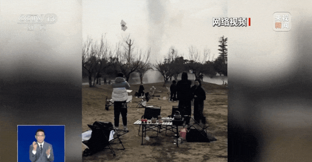2月1日下午2点左右,不少市民在开阔的草坪上露营。突然,一阵旋风出现,中心卷起大量尘土,形成明显的涡旋,周边数顶帐篷被瞬间掀翻,市民纷纷避让。